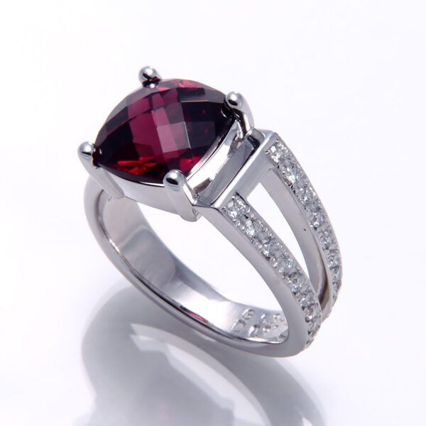 TAKAオリジナルのハンドメイド1点ものリングです。 チェッカーカットのロードライトガーネットにアシンメトリーでモダンなデザインが特徴的です。