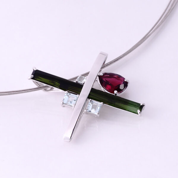 TAKAオリジナルのハンドメイド1点ものネックレスです。 ロングサイズのトルマリンを貴金属のバーとクロスにしたモダンなデザインのネックレスです。