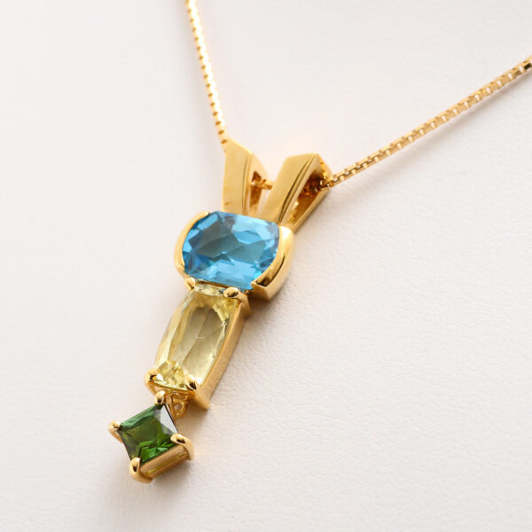 TAKAオリジナルのハンドメイド1点ものネックレスです。 色や形の違う宝石をカラフルに並べたネックレスです。バチカンが一体化したモダンなデザインです。